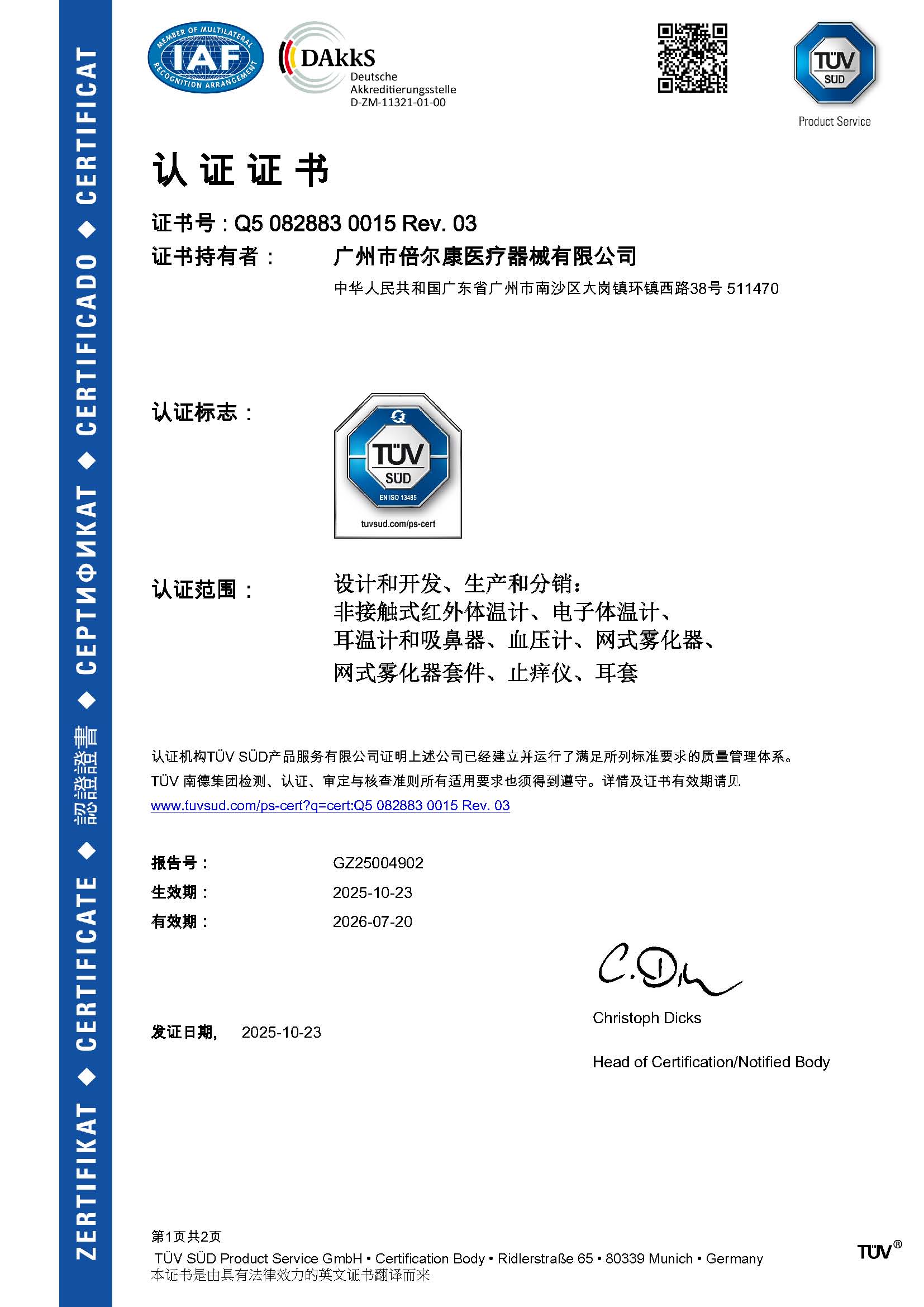 公司秉承“質(zhì)量第一、創(chuàng)新驅(qū)動”的發(fā)展理念,擁有智能化生產(chǎn)線和嚴格的質(zhì)量管理體系,產(chǎn)品通過ISO 13485、CE、FDA等國際權(quán)威認證,擁有多項國家技術(shù)專利,并獲評“廣東省醫(yī)用紅外體溫測量工程技術(shù)研究中心”。在呼吸治療領(lǐng)域,倍爾康依托成熟的技術(shù)平臺與醫(yī)療級品控體系,推出專業(yè)霧化器產(chǎn)品,致力于為醫(yī)院及家庭用戶提供高效、安全、穩(wěn)定的霧化治療解決方案,廣泛適用于兒科、呼吸科及家庭康復(fù)等多個場景。