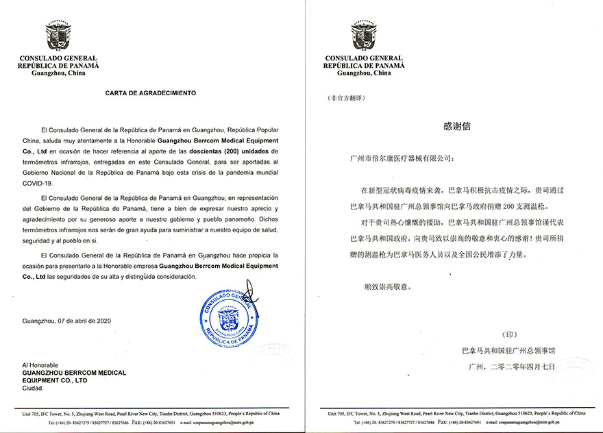 信中提到,倍爾康捐贈的非接觸式紅外體溫計(jì)將為巴拿馬醫(yī)務(wù)人員及全國公民增添力量。