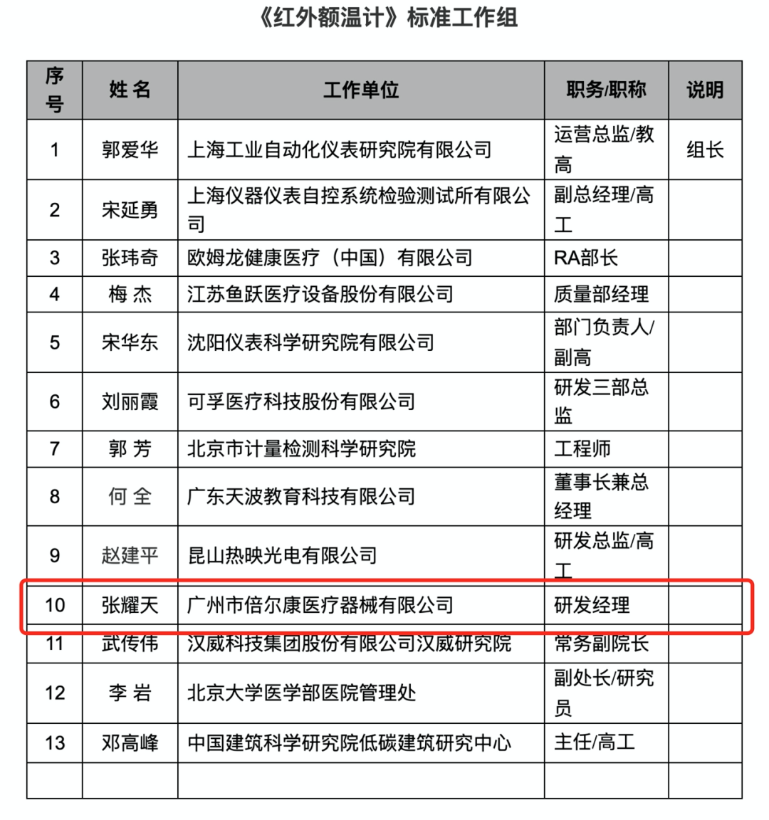 早在今年的4月份,中國儀器儀表學(xué)會為滿足市場的需要,規(guī)范產(chǎn)品的技術(shù)要求、測量準確度、可靠性等質(zhì)量要求,規(guī)范一致的試驗方法,用標準促進紅外額溫計產(chǎn)品在整體質(zhì)量和性能上的全面提升等成立了紅外額溫計標準制定工作組,倍爾康的研發(fā)經(jīng)理張耀天作為行業(yè)代表參與了這項工作。