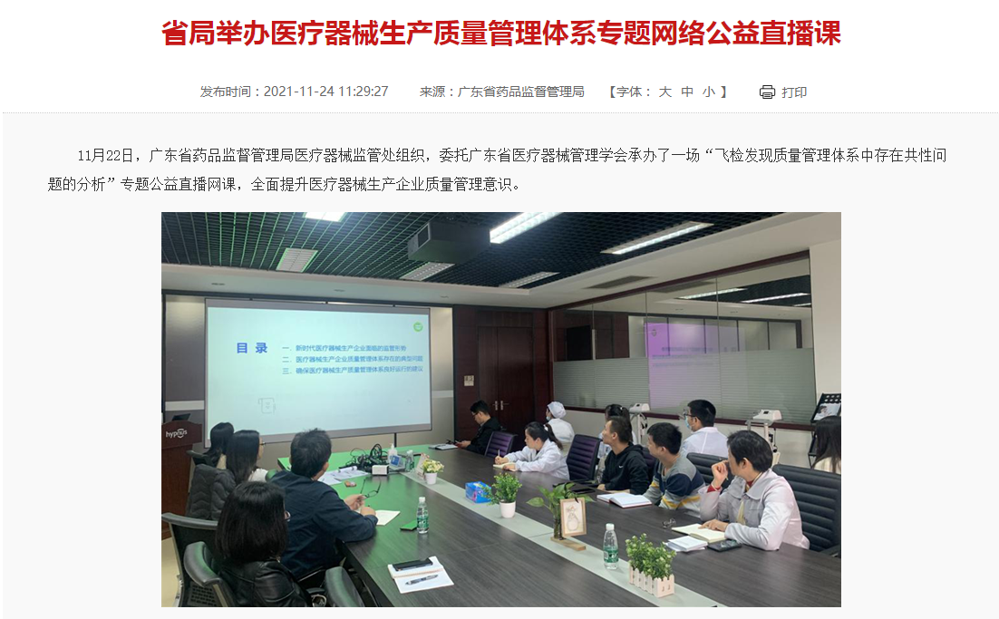 11月22日,廣東省藥品監(jiān)督管理局醫(yī)療器械監(jiān)管處組織,委托廣東省醫(yī)療器械管理學(xué)會(huì)承辦了一場(chǎng)“飛檢發(fā)現(xiàn)質(zhì)量管理體系中存在共性問題的分析”專題公益直播網(wǎng)課,全面提升醫(yī)療器械生產(chǎn)企業(yè)質(zhì)量管理意識(shí)。