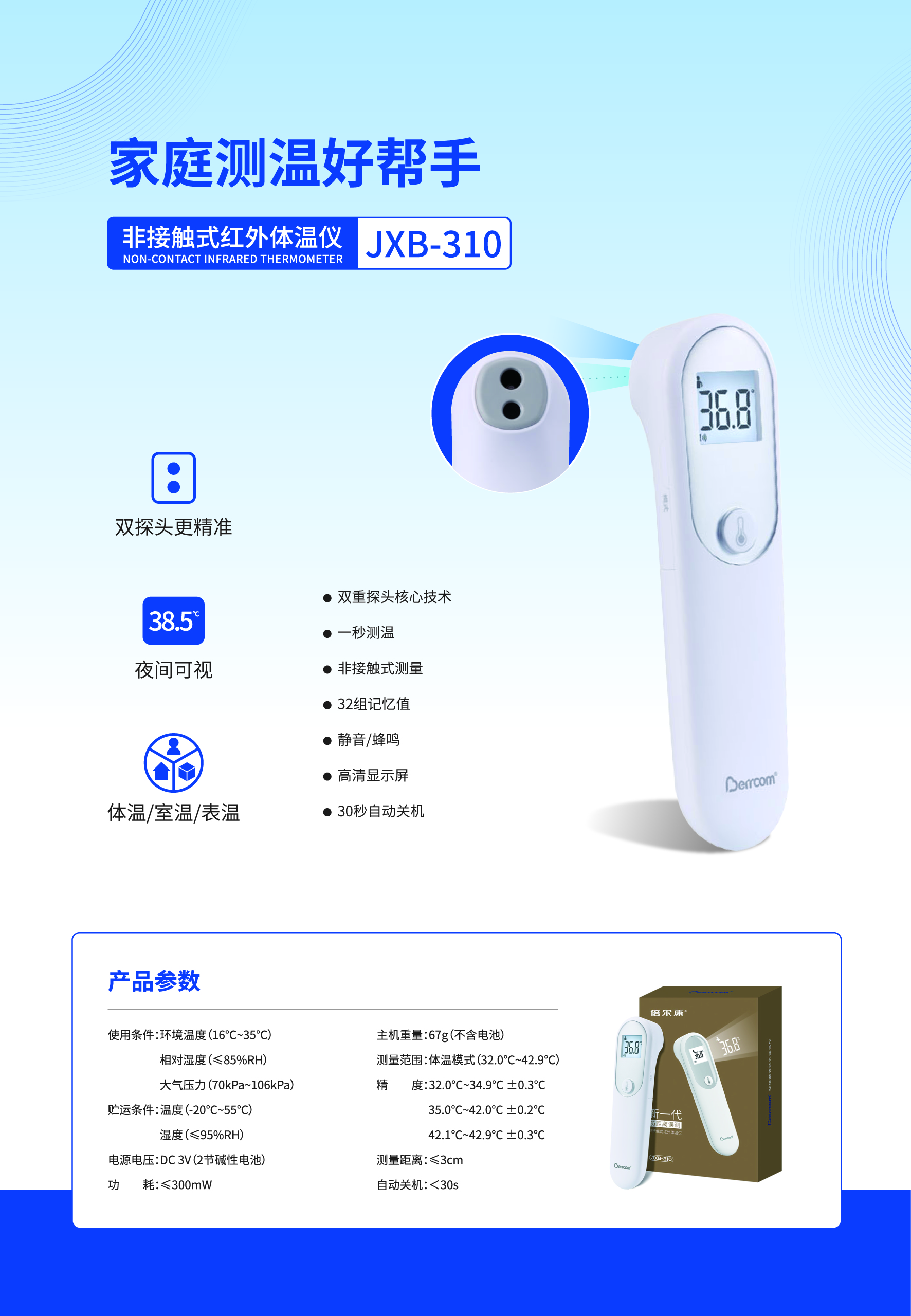 一秒測溫,一鍵測溫,高溫蜂鳴提示,貼心關(guān)懷